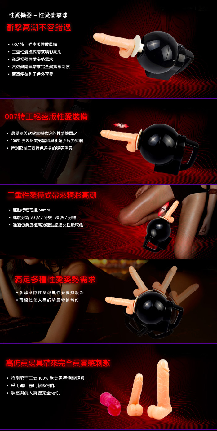 1、007特工絕密版性愛裝備,最受欲望主婦歡迎的性愛機器之一,以100%複製歐美男星陽具和超強馬力衝刺聞名。性愛衝擊球特別針對人們內心深處的欲望渴求定制,專門配備了三支猛男陽具倒模,滿足每個成熟女性希望同時擁有多個強健性伴侶的性愛願望。