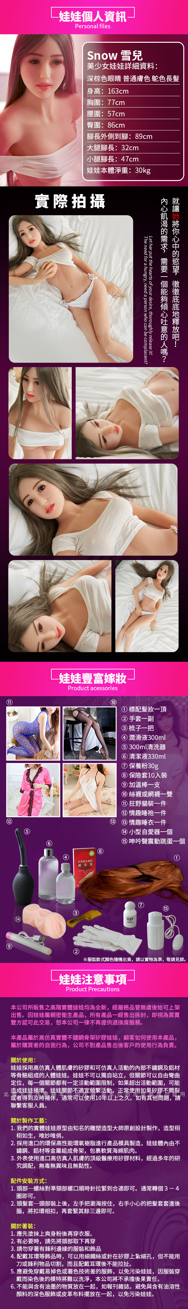 .商品內容:Snow 雪兒 不銹鋼變形 真人實體娃娃 乳交 肛交 陰交 真人倒模 情趣骨骼娃娃 163cm / 30kg 非充氣娃娃